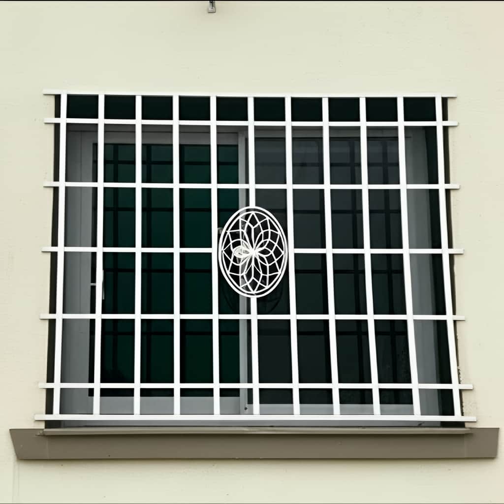 حفاظ پنجره مدل خورشیدی با طراحی شبکه ای منظم و المان تزئینی بیضی شکل در مرکز, که شبیه به شعاع های خورشید است, به عنوان یک نماد از امنیت, انرژی و زیبایی, انتخابی مناسب برای ساختمان های مدرن و صنعتی می باشد. این مدل با ترکیب عناصر سنتی و مدرن, نه تنها امنیت عالی را فراهم می کند, بلکه نمای ساختمان را با جلوه ای شیک و نمادین تزئین می نماید.